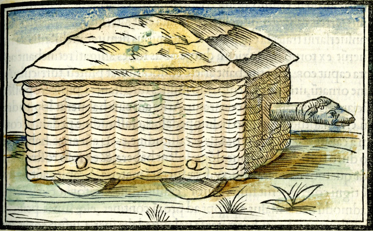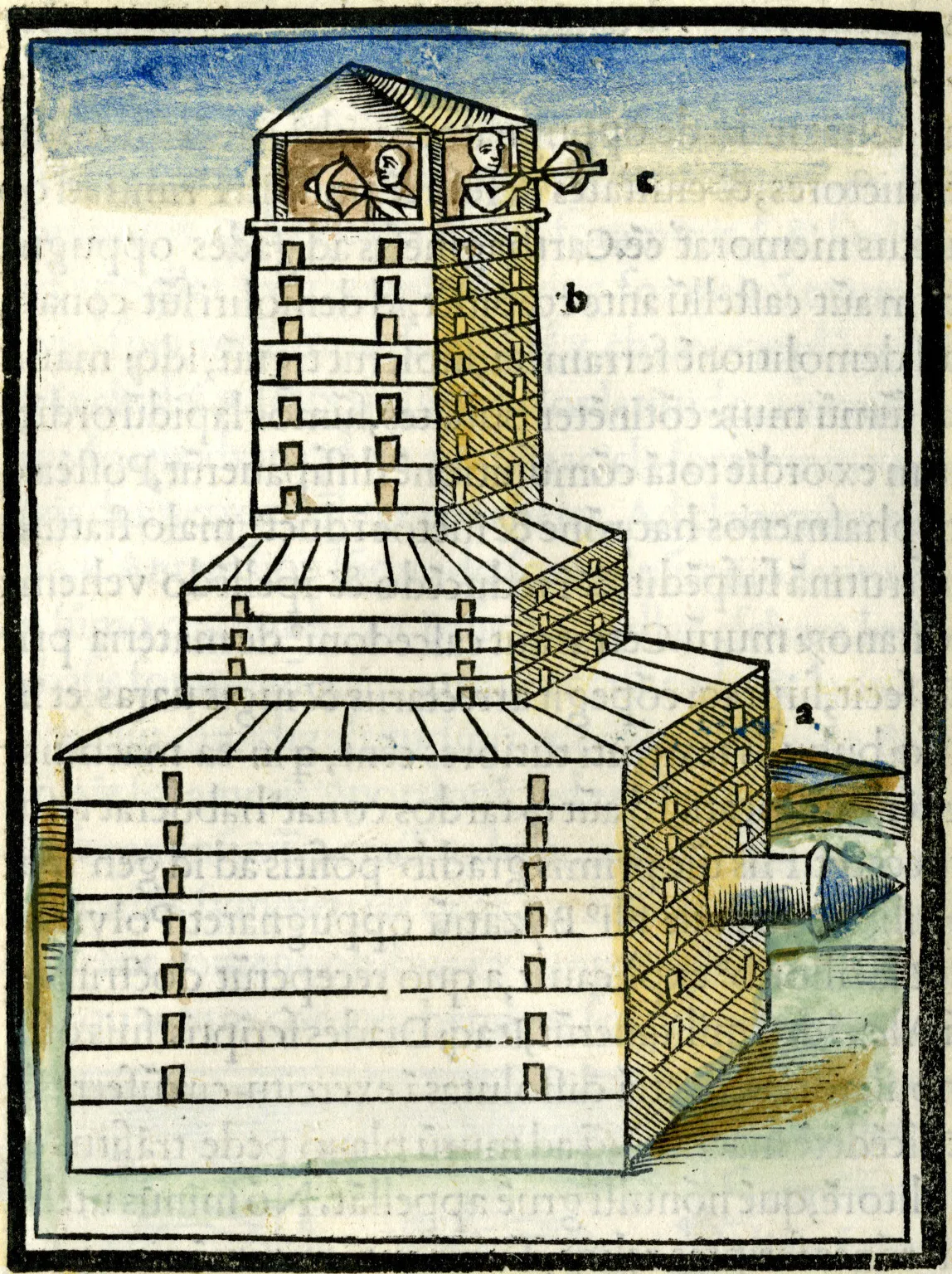 There are examples of the different orders of columns, designs of aqueducts, even a method of central heating under the floor. The machinery includes drawings of cranes, water wheels and the siege towers, one in the shape of a tortoise.