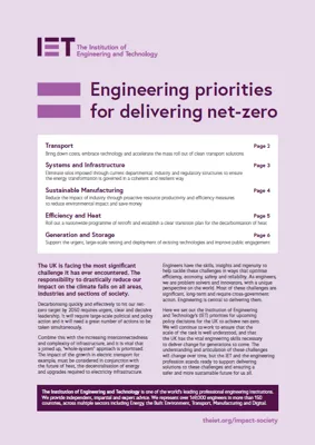 In this paper, we set out our engineering priorities for upcoming policy decisions that will allow the UK to achieve its net-zero target. These priorities are divided across Transport, Systems and Infrastructure, Sustainable Manufacturing, Efficiency and Heat and Generation and Storage.