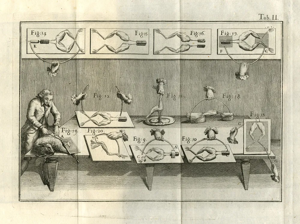 Shown here is an illustration of Luigi Galvani's famous frog experiments taken from his work, De Viribus - Electricitatis in Motu Musculari, 1792.