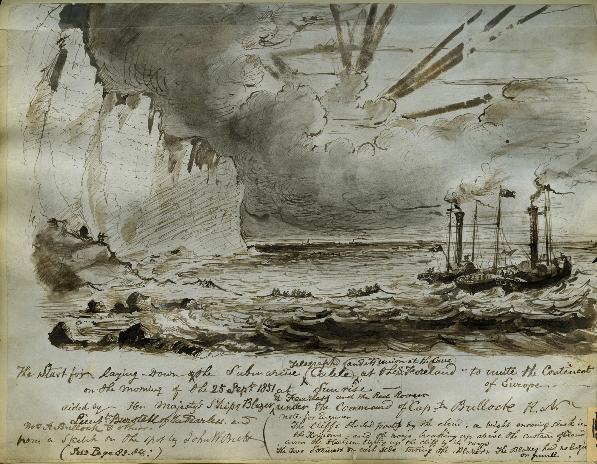 John Brett made the sketch himself on the second voyage to unite the Continent of Europe, 25 September 1851. It states that the voyage was aided by Her Majesty's Ships Blazer, Fearless and the Red Rover under the command of Captain Bullock.