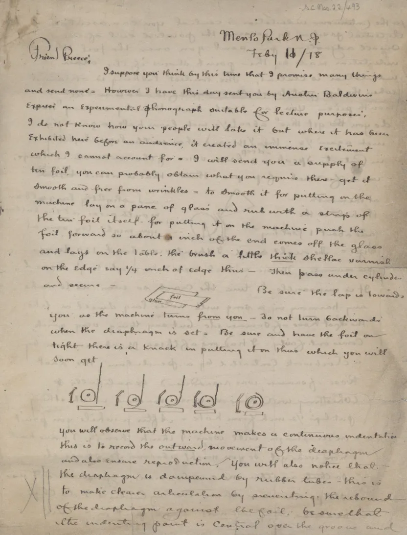 In 1878 Sir William Preece demonstrated the Edison Phonograph. The phonograph was a device invented by Thomas Edison for the playing and recording of sound and heralded a new era in sound technology. A letter in the IET Archives gives detailed instructions to Preece on how to operate the phonograph for this lecture.