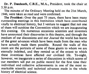 The technical introduction was given by Sir Robert Watson-Watt. The principle speaker was the Minister of Supply, the Rt. Hon. John Wilmot who said “It is, of course, an outstanding tribute to this Institution that it is at your Convention that these remarkable discoveries are to be made known.”