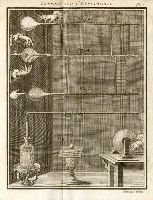 The images below depict the experiments conducted by L'Abbe Jean Antoine Nollet an ardent supporter of the two-fluid theory.