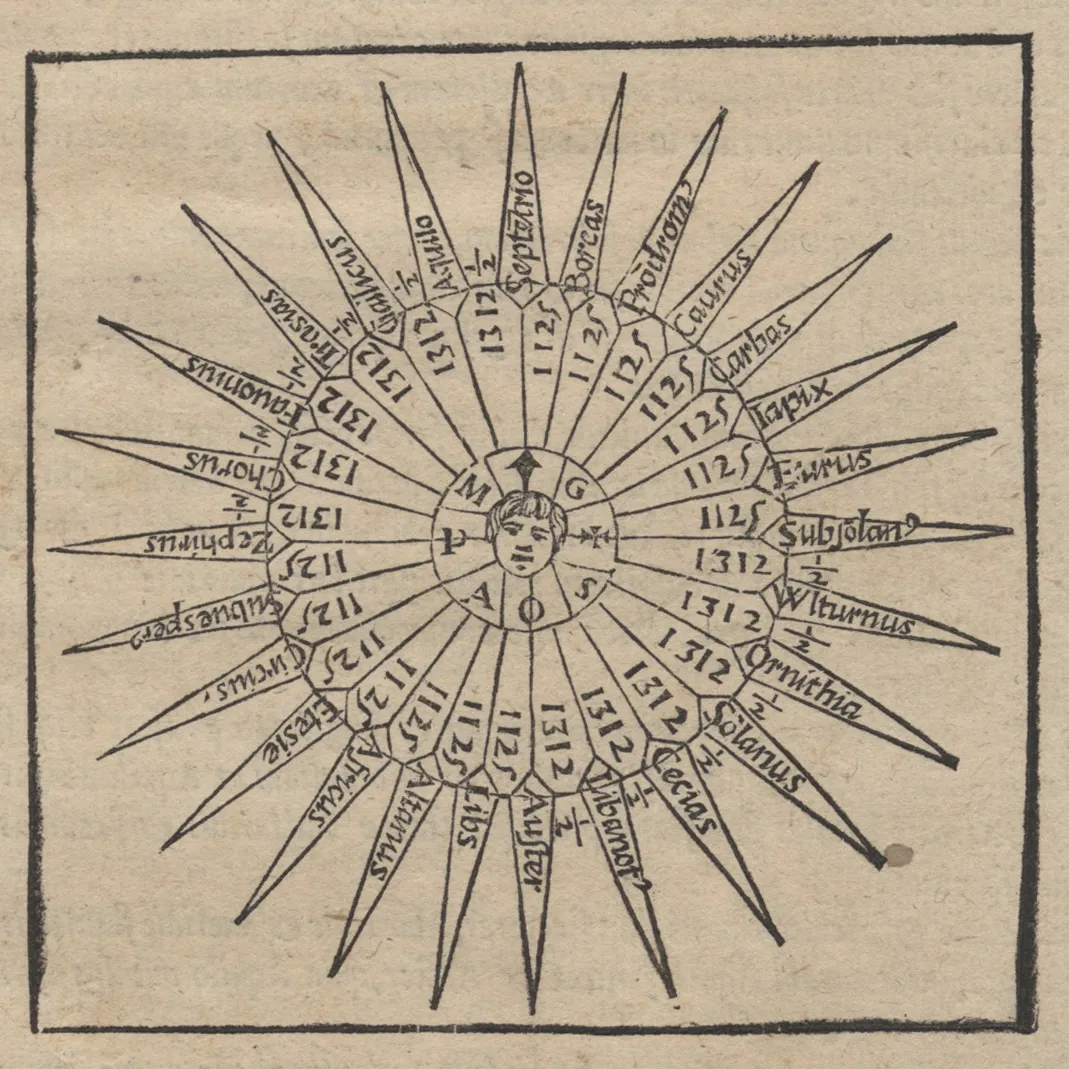 Wind roses appear in many early treatises on navigation. The wind rose shown in the illustration is from Michael Angelus Blondus' treatise De Ventis et Navigatione, published in Venice in 1546. It is unusual in having only 26, rather than 32 points, meaning that Zephirus, the west wind, is not directly opposite Eurus, the east wind. The following chapter is even more interesting, as it gives a very early account of sailing to the New World.