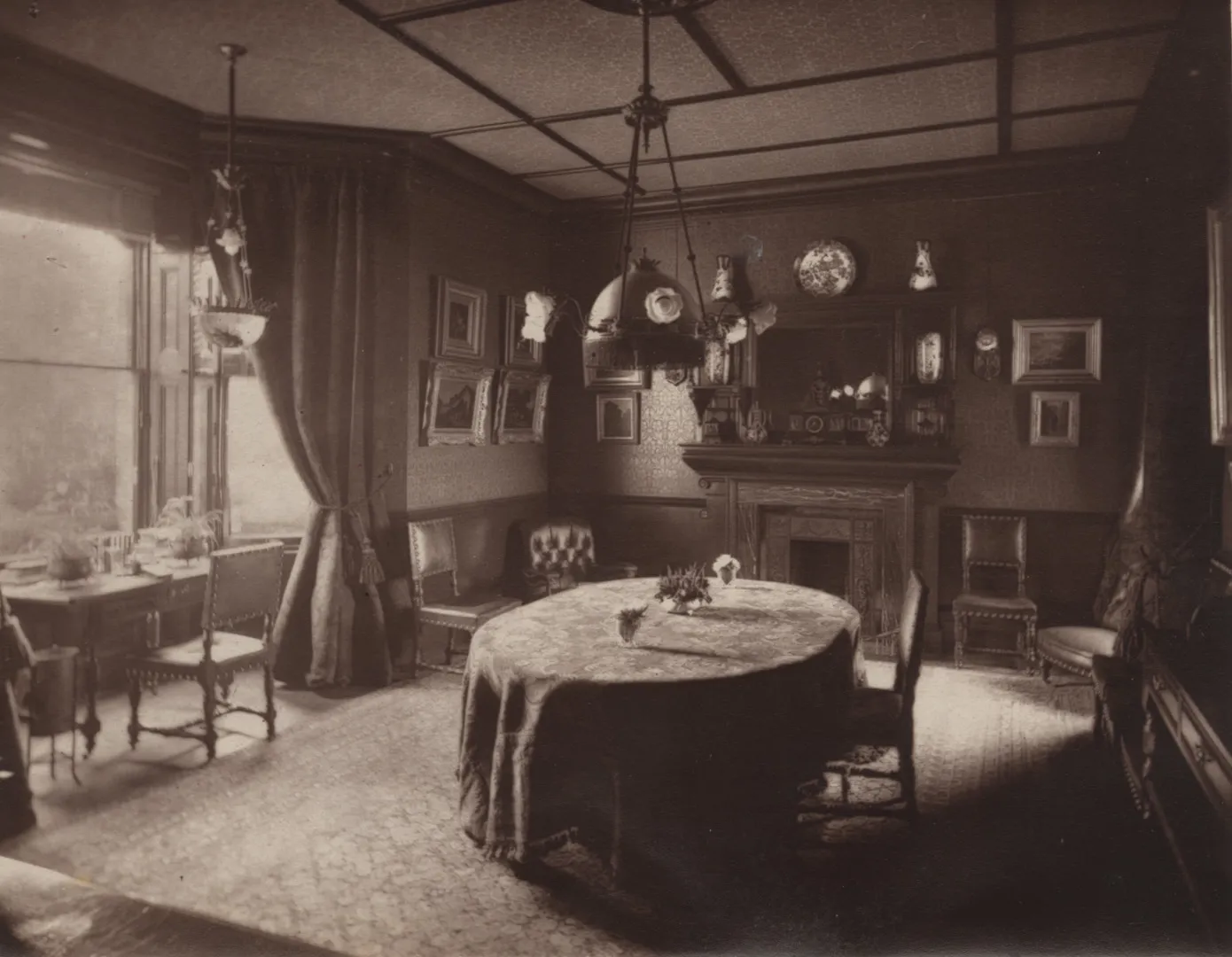 Early electric lighting in a domestic setting; a dining room from Robert Hamond's book 'The Electric Light in our Homes' c1884