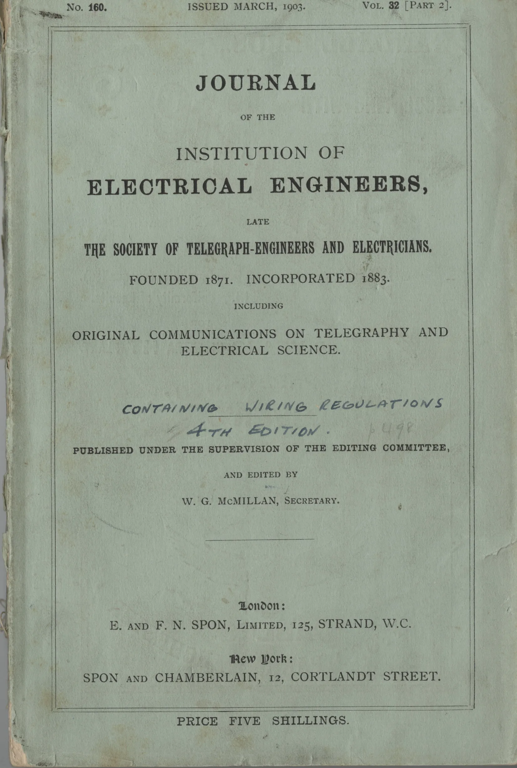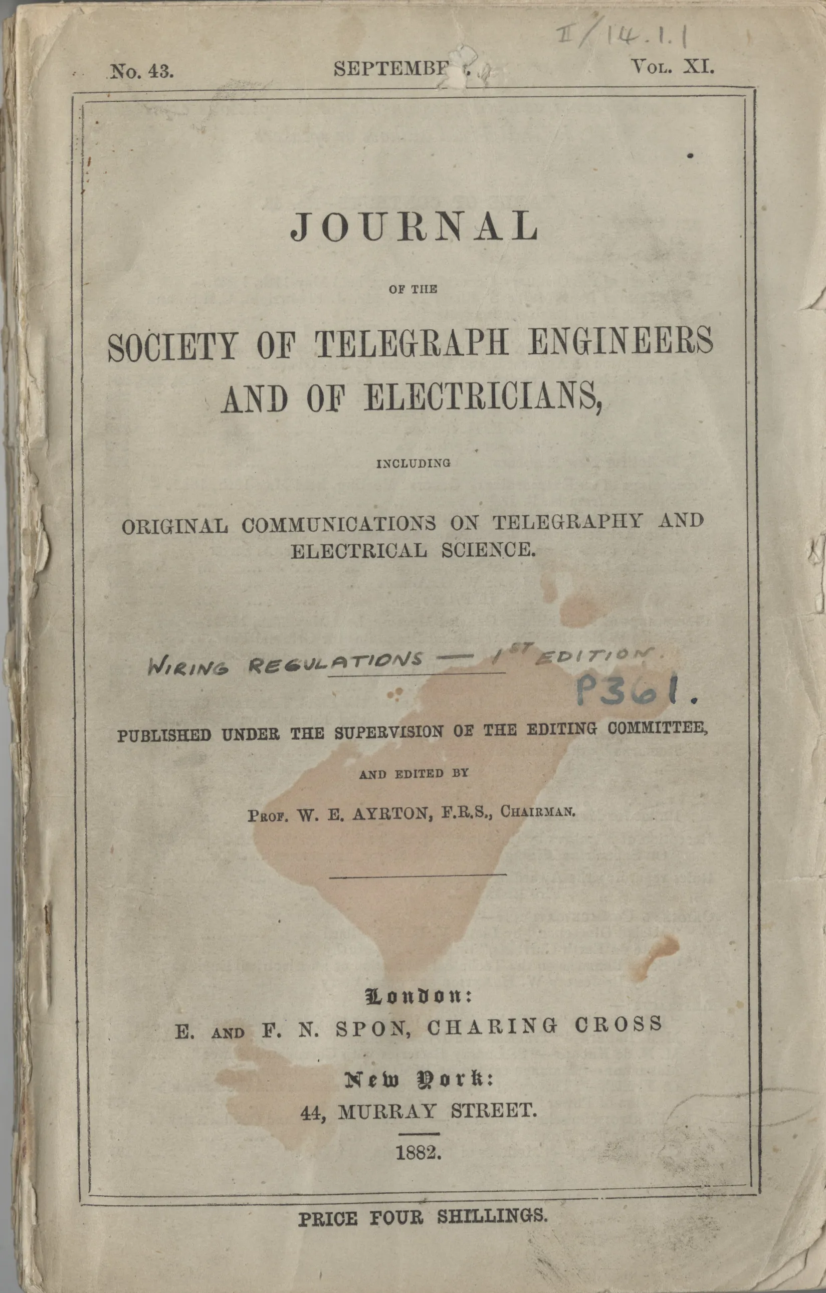 Cover of the STEE Journal that includes the first edition of the Wiring Regulations 1882