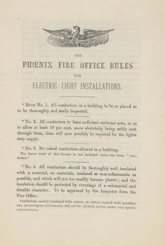 There were 19 rules in total in the first edition, five of which were concerned with dynamo machines, nine with wiring, two with lamps and the final three with ‘Danger to Person’.