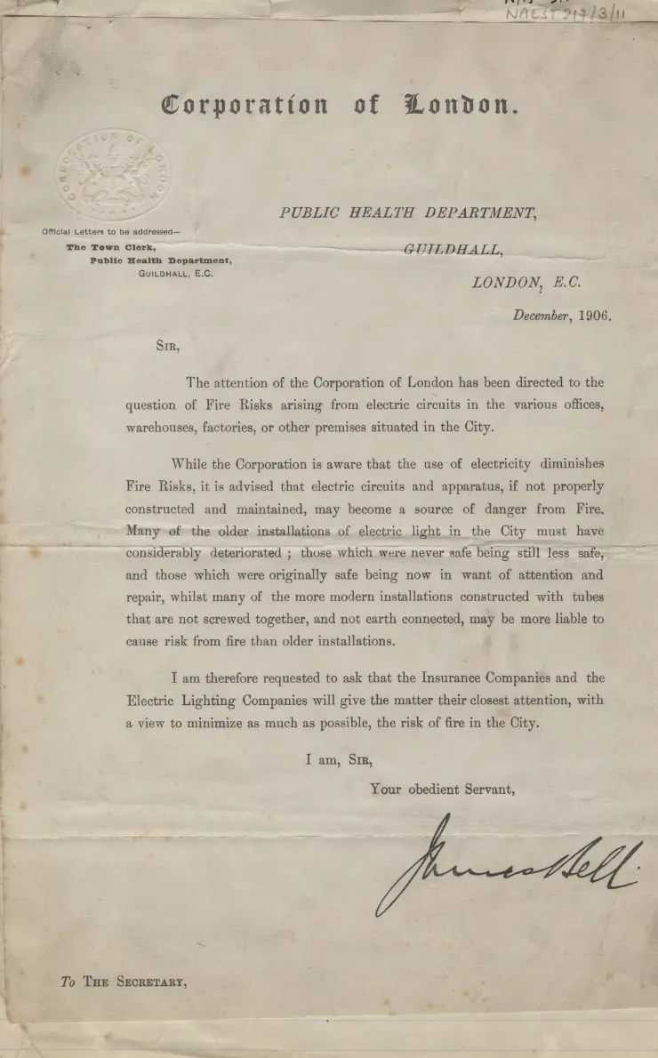 In 1906 a letter was sent from the Public Health Department to insurance companies and electric lighting companies highlighting fire risks arising from electric circuits and apparatus, if not properly constructed and maintained, and requesting them to 'give the matter their closest attention.'